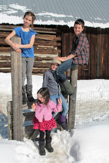 We stood by the road as they wandered into our neighbour's field (we swear, we didn't notice the No Trespassing sign until they'd come back out) and watched them play, and marveled at the fun of having an uninterrupted conversation. We posed for a rare picture together. The littlest one trotted across the crust on top of the snow in her running shoes (she insisted) and returned to fetch her big brother's Adventure Bag. There were no tears and no bickering.